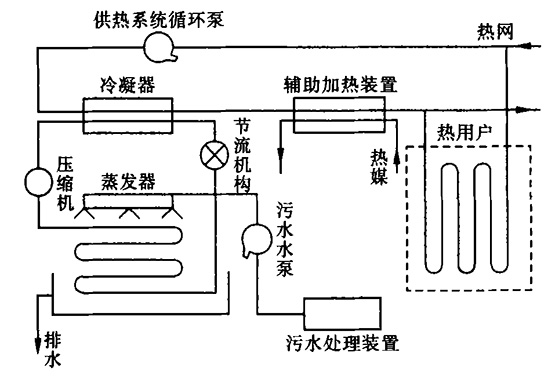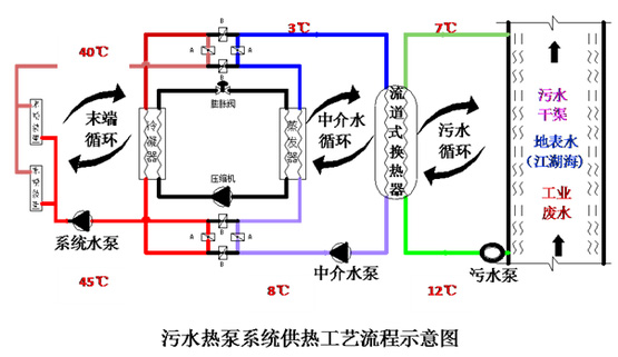 污水源熱泵系統(tǒng)由通過水源水管路和冷熱水管路的水源系統(tǒng)、熱泵系統(tǒng)、末端系統(tǒng)等部分相連接組成。